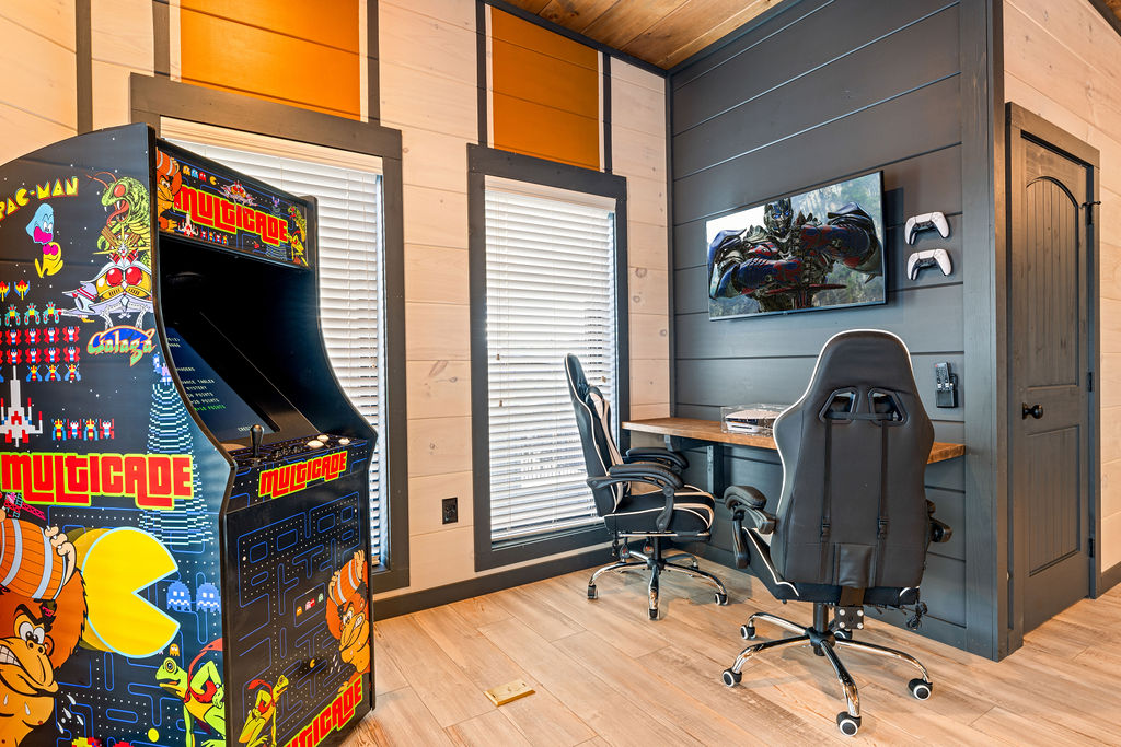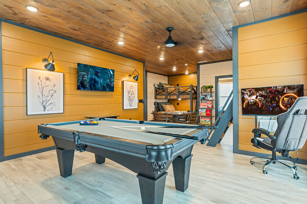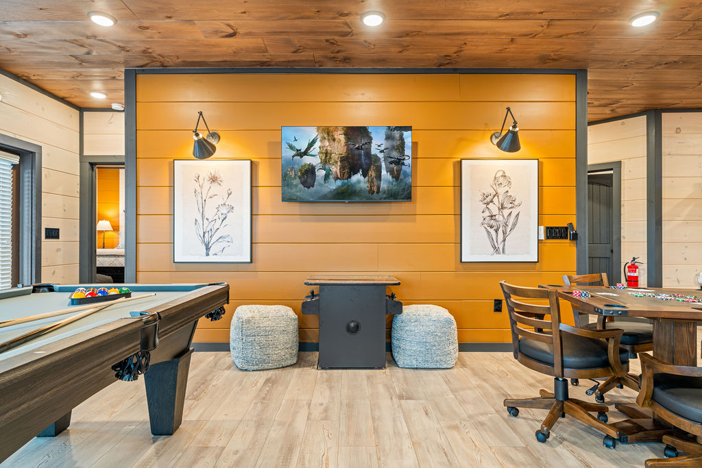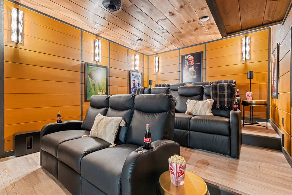 ⭐ Impeccable cabin with modern amenities: Indoor Pool, Sauna, Upscale Home Theater, Game Room, Pool Table ⭐ Exclusive Water Park: Ramling Creek, Mini Golf, Outdoor Movie and many more!