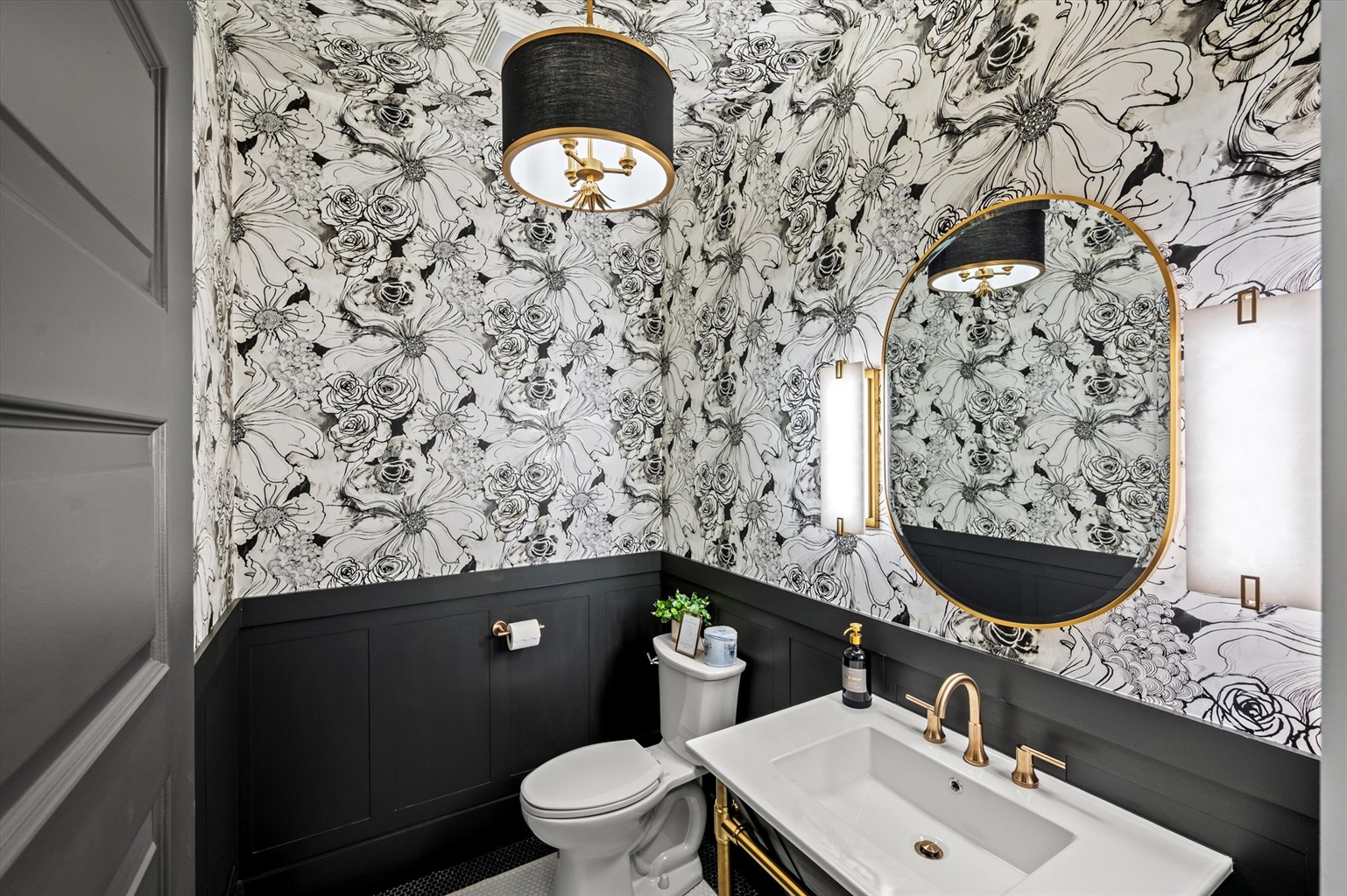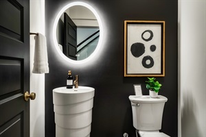 Thoughtfully designed half-bathroom featuring modern fixtures and a sleek vanity.