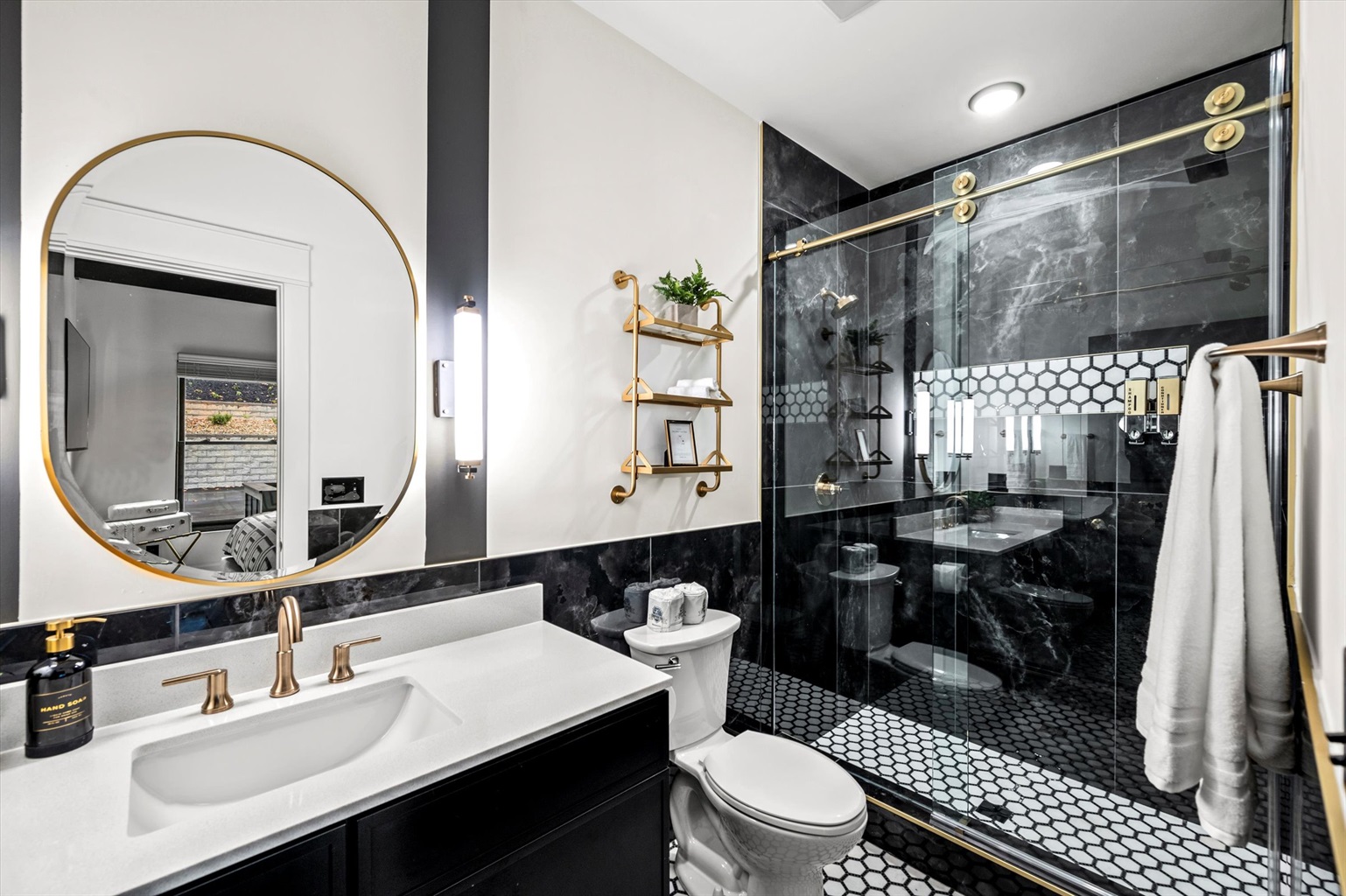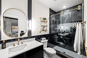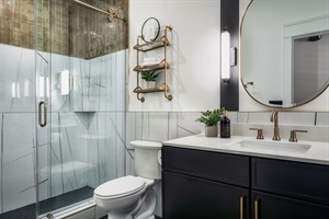 A masterfully designed en-suite bathroom, complete with a glass-enclosed walk-in shower and modern finishes.