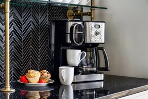Bar area with mini fridge, for a cozy movie night while enjoying your favorite beverages!